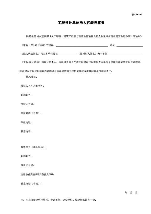 表格名称:表A5-1-2 工程设计单位法人代表授权书