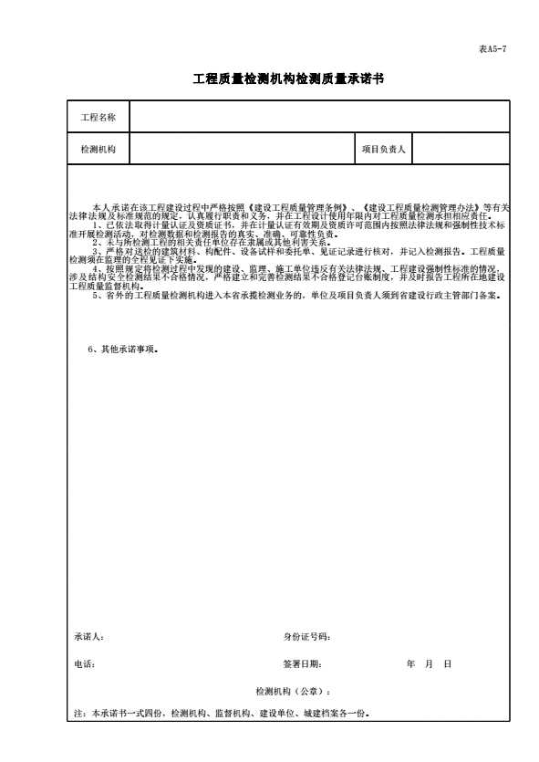 表格名称:表A5-7 工程质量检测机构检测质量承诺书