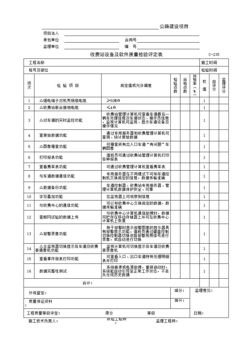 表格名称:C-235 收费站设备及软件质量检验评定表
