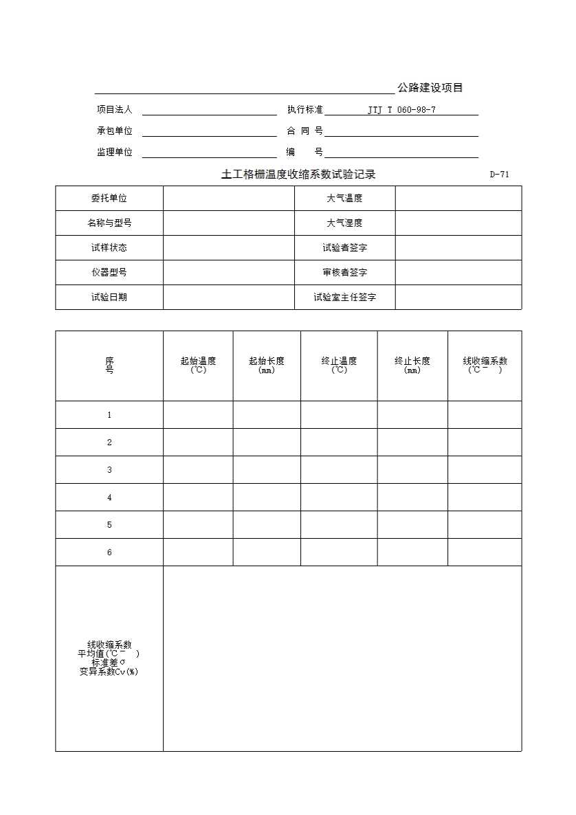 表格名称:D-71 土工格栅温度收缩系数试验记录