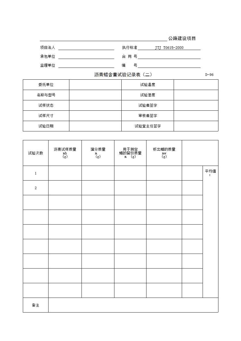 表格名称:D-96 沥青蜡含量试验记录表(二)