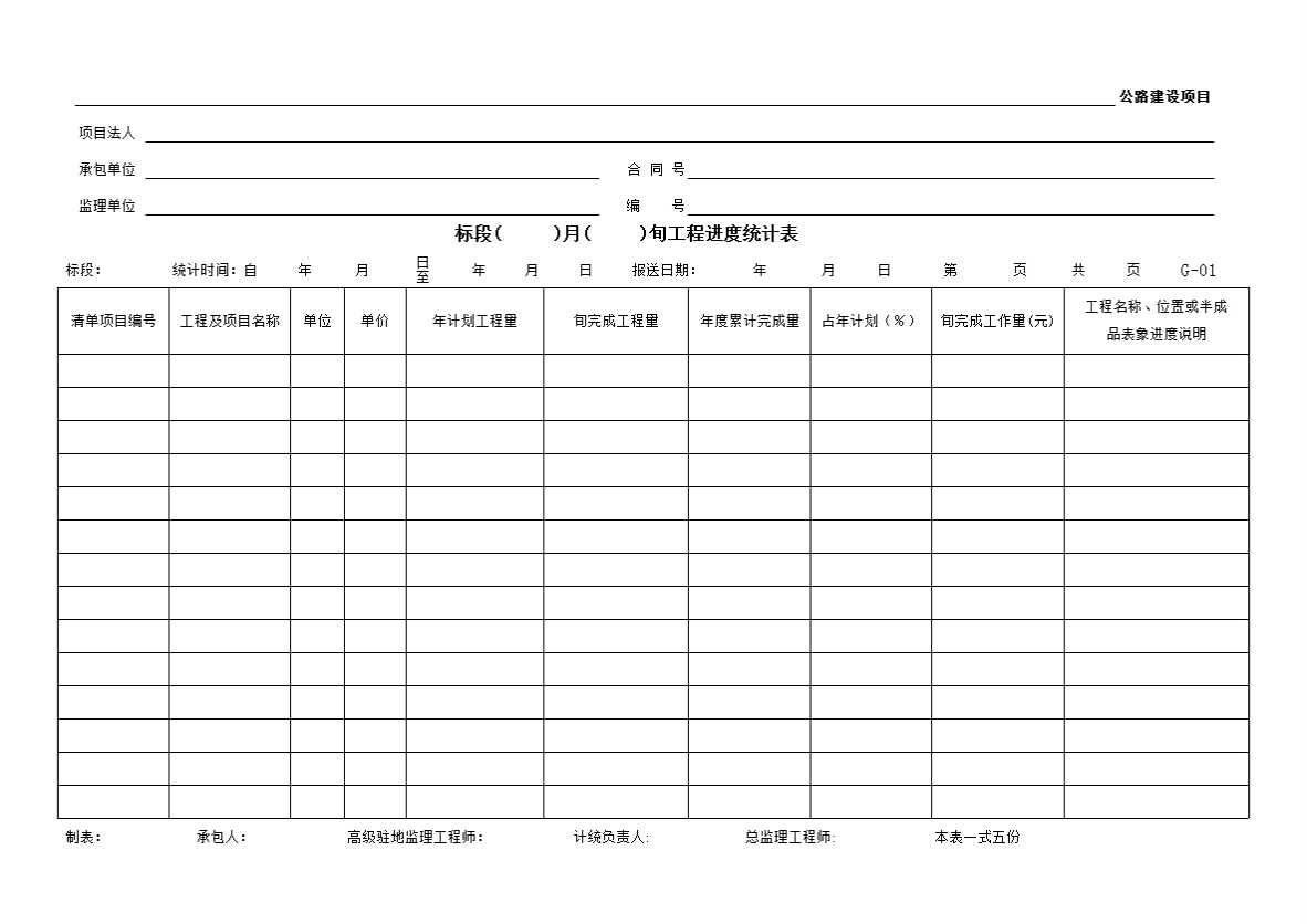 表格名称:G-01 标段( )月( )旬工程进度统计表