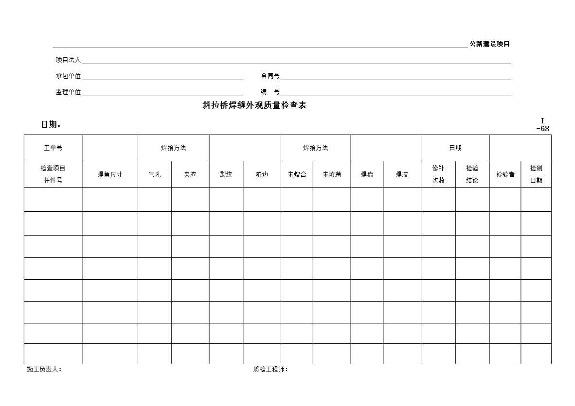 表格名称:I-68斜拉桥焊缝外观质量检查表
