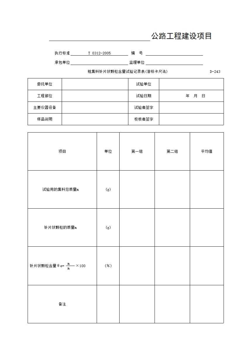 表格名称:D-243 粗集料针片状颗粒含量试验记录表(游标卡尺法)