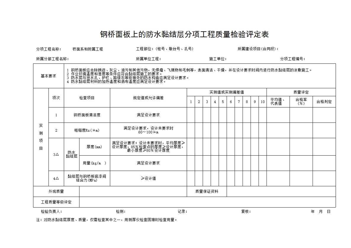 表格名称:钢桥面板上的防水黏结层分项工程质量检验评定表