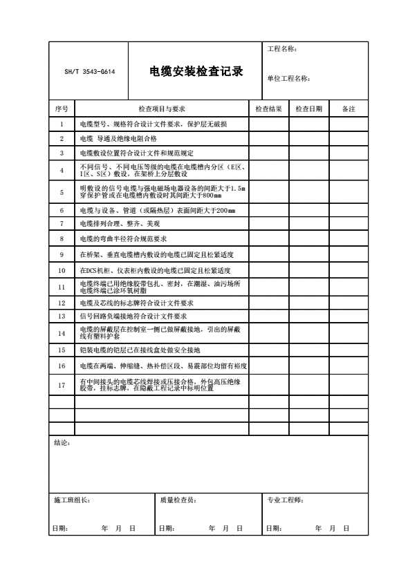 表格名称:SH/T 3543-G614 电缆安装检查记录