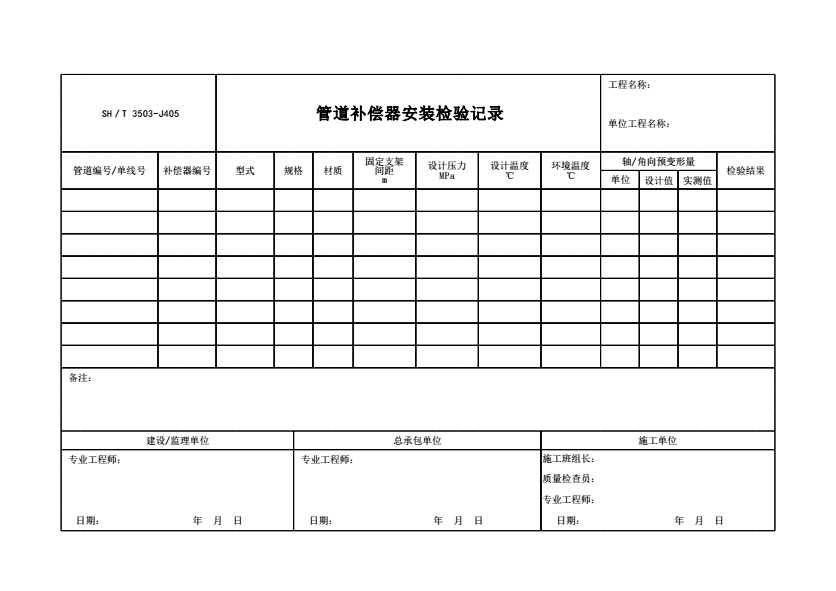 表格名称:SH/T 3503-J405 管道补偿器安装检验记录