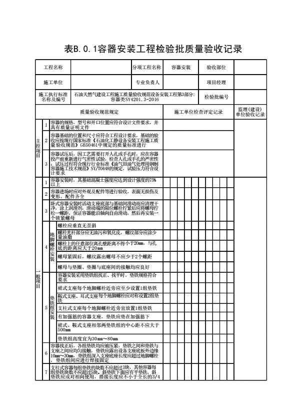 表格名称:表B.0.1 容器安装工程检验批质量验收记录