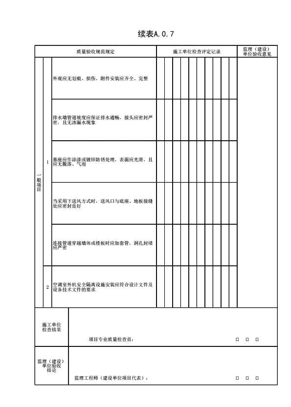 表格名称:表A.0.7 设备间空调安装及调试安装检验批质量验收记录