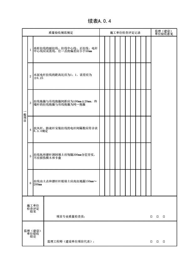 表格名称:表A.0.4 拉线、撑杆安装及回填检验批质量验收记录