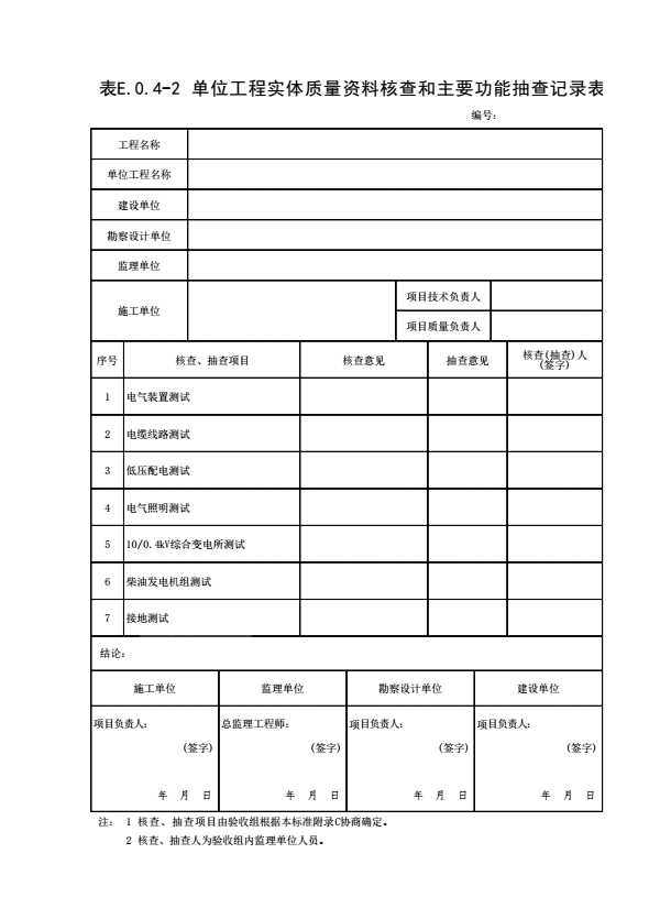 表E.0.4-2 单位工程实体质量资料核查和主要功能抽查记录表