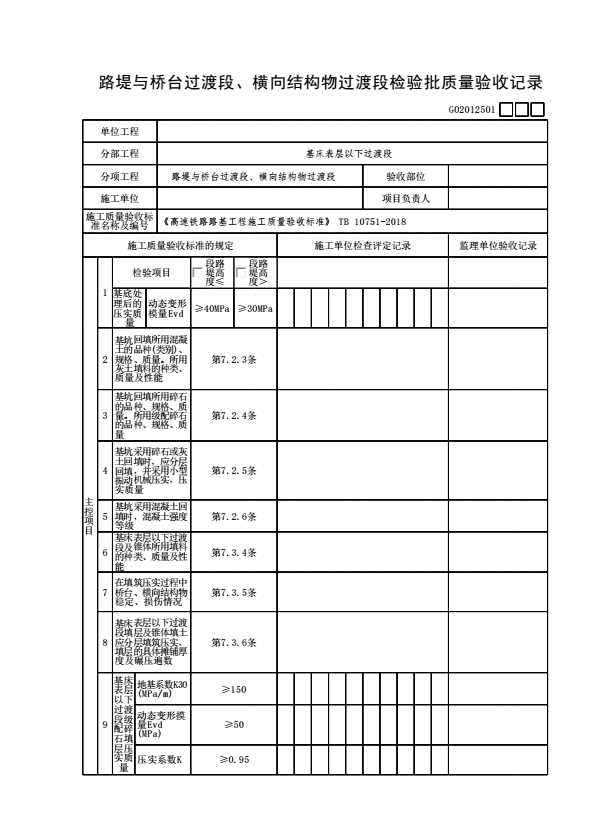 表格名称:G02012501 路堤与桥台过渡段、横向结构物过渡段检验批质量验收记录
