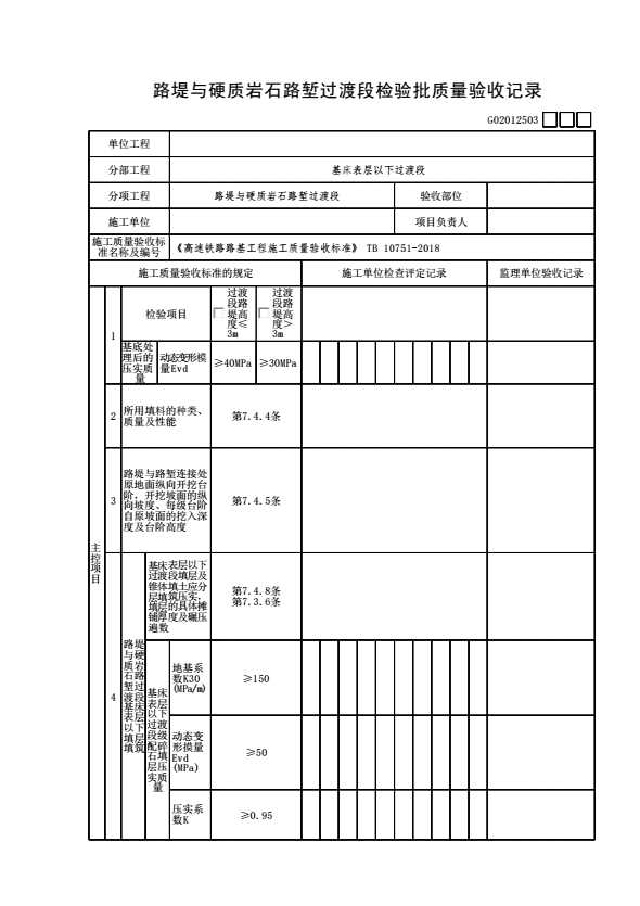 表格名称:G02012503 路堤与硬质岩石路堑过渡段检验批质量验收记录