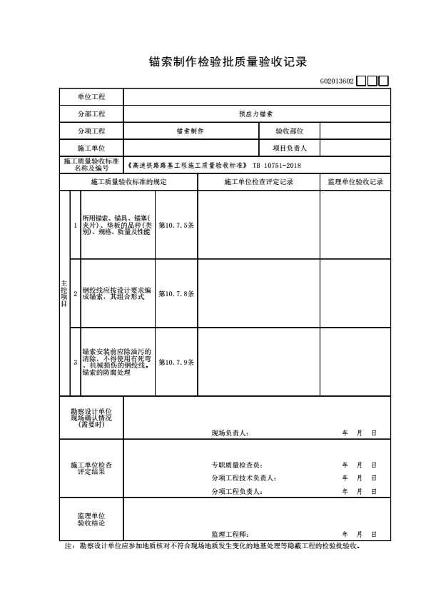 表格名称:G02013602 锚索制作检验批质量验收记录