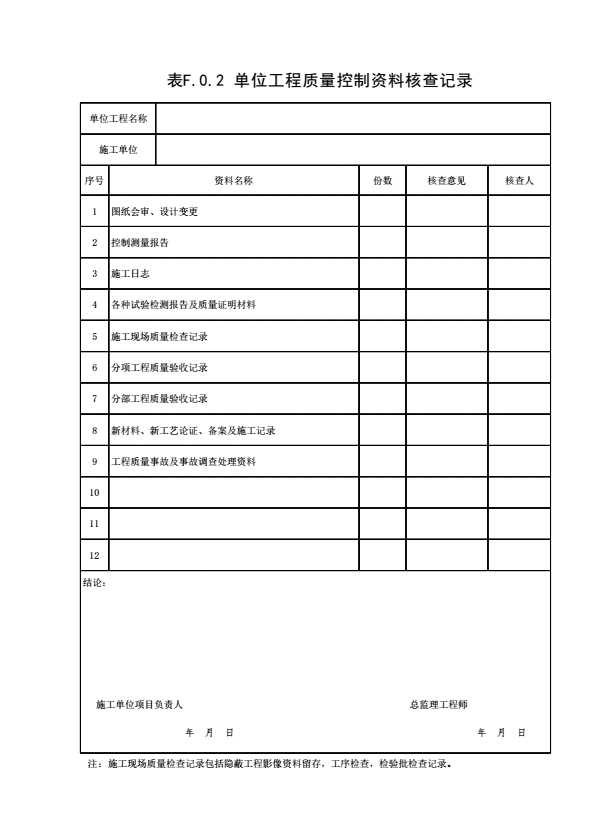 表格名称:表F.0.2 单位工程质量控制资料核查记录