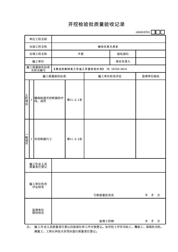 表格名称:G04010701 开挖检验批质量验收记录