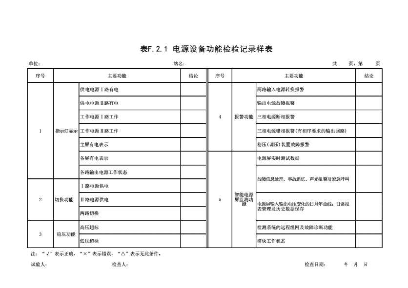 表格名称:表F.2.1 电源设备功能检验记录样表