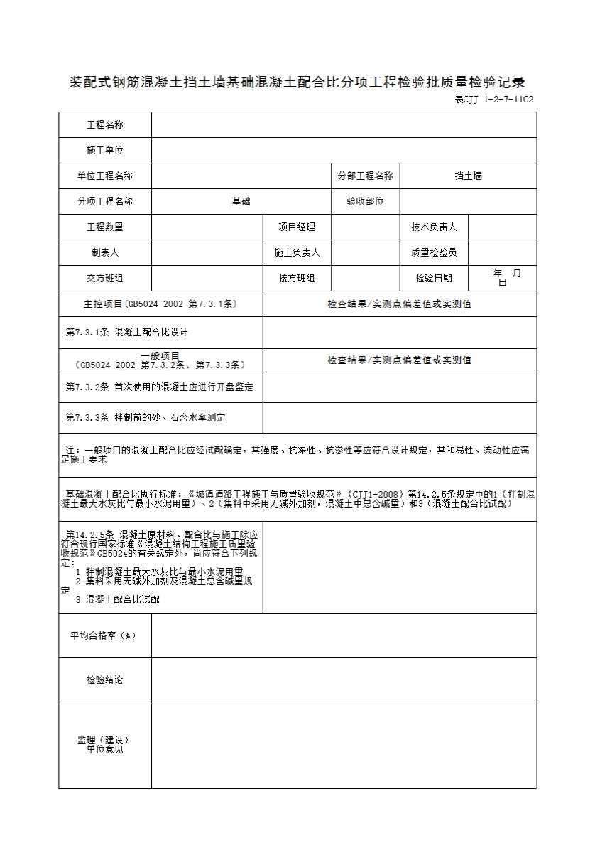 表格名称:表CJJ 1-2-7-11C2 装配式钢筋混凝土挡土墙基础混凝土配合比分项工程检验批质量检验记录