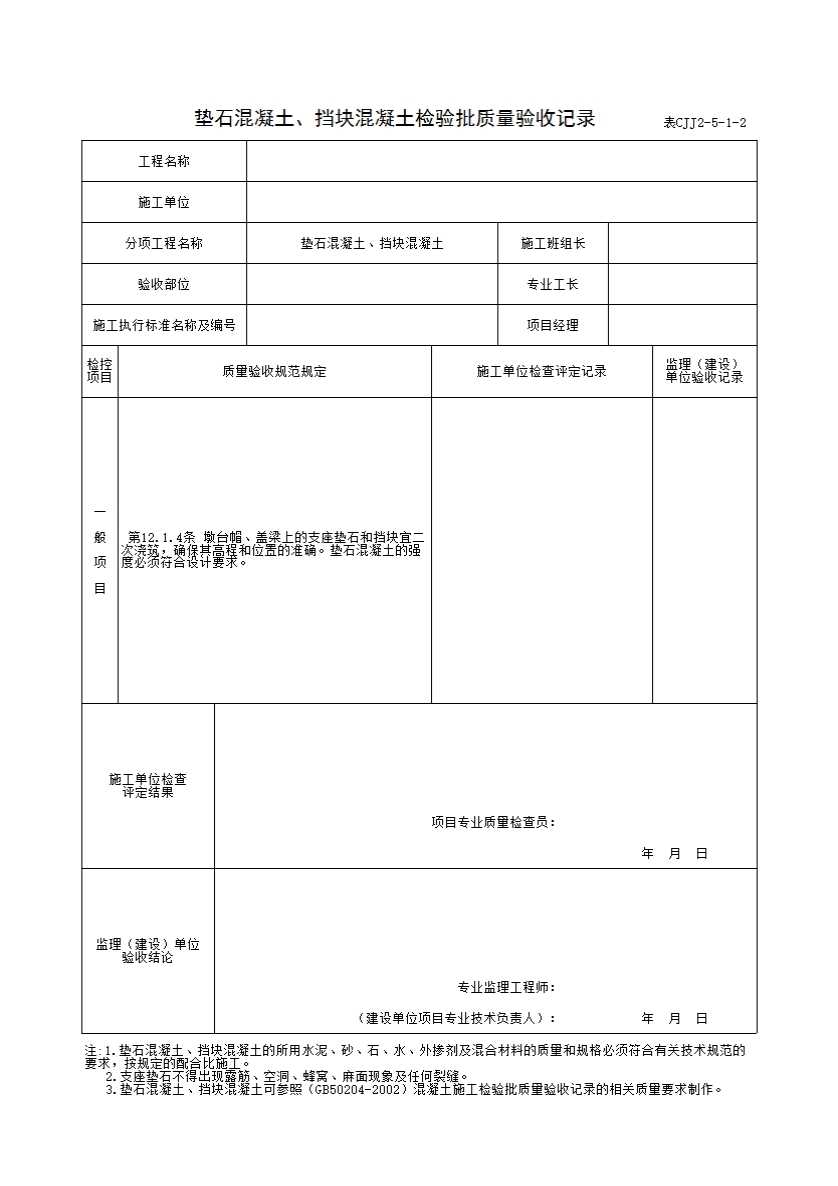 表格名称:表CJJ 2-5-1-2 垫石混凝土、挡块混凝土检验批质量验收记录