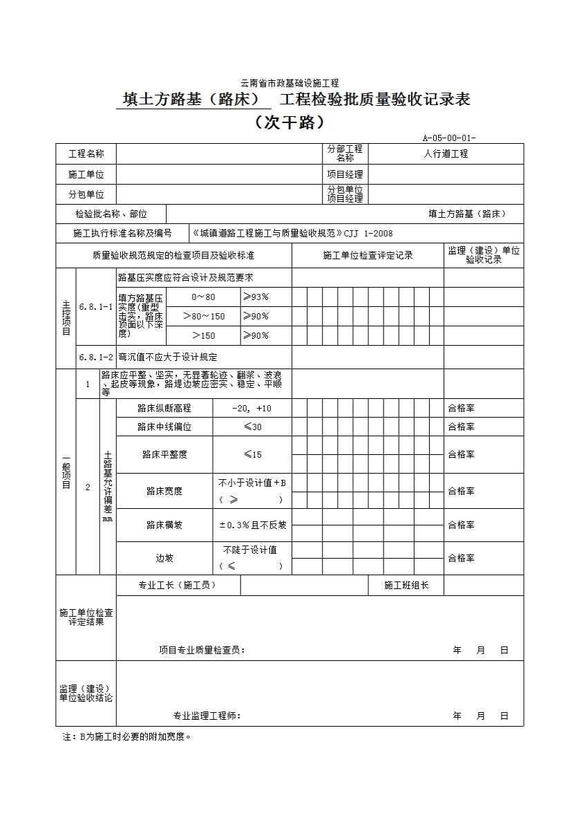 表格名称:05000103 填土方路基(路床)工程检验批质量验收记录表(次干路)