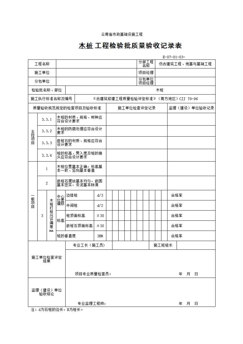 表格名称:07010302 木桩工程检验批质量验收记录表