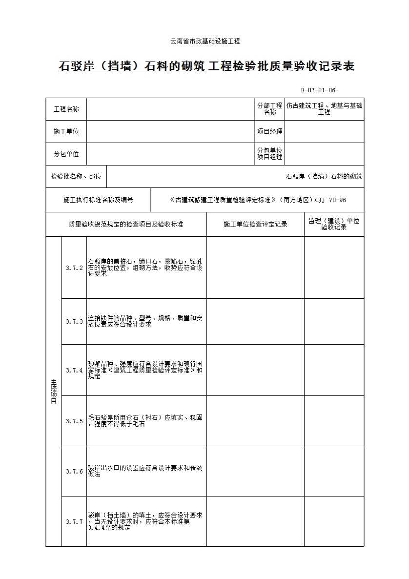 07010603 石驳岸(挡墙)石料的砌筑工程检验批质量验收记录表