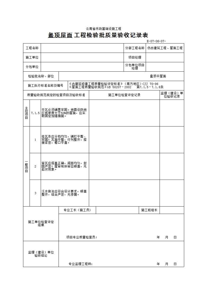 表格名称:07060703 盠顶屋面工程检验批质量验收记录表