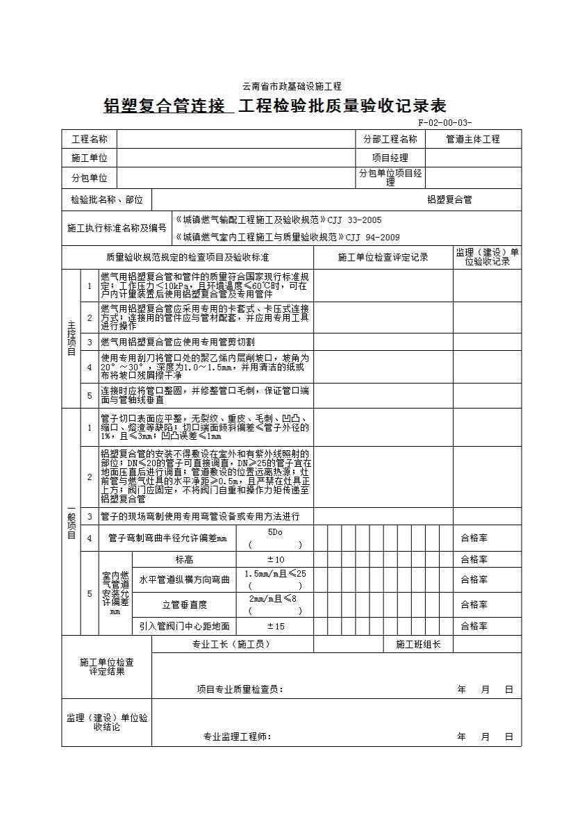 表格名称:02000307 铝塑复合管连接工程检验批质量验收记录表