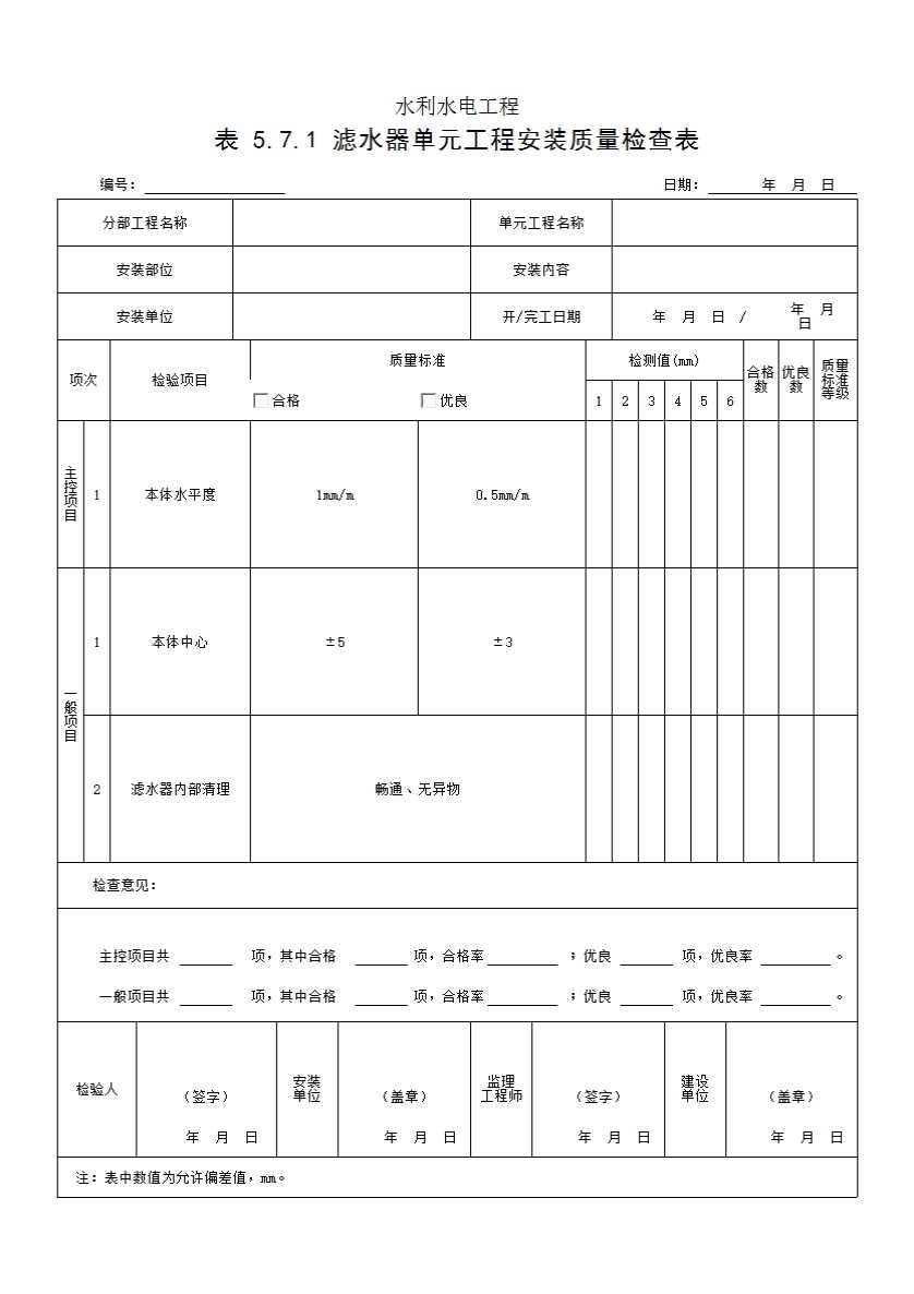 表格名称:表 5.7.1 滤水器单元工程安装质量检查表