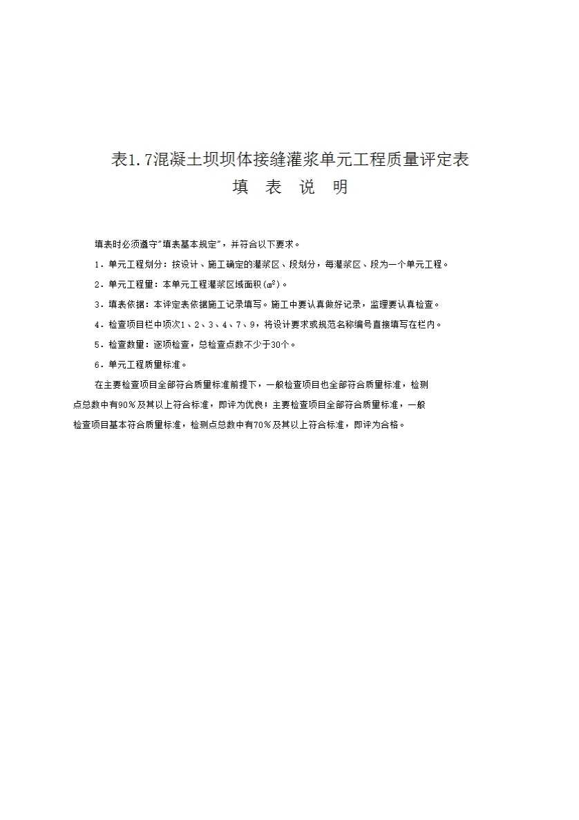 表1.7 混凝土坝坝体接缝灌浆单元工程质量评定表