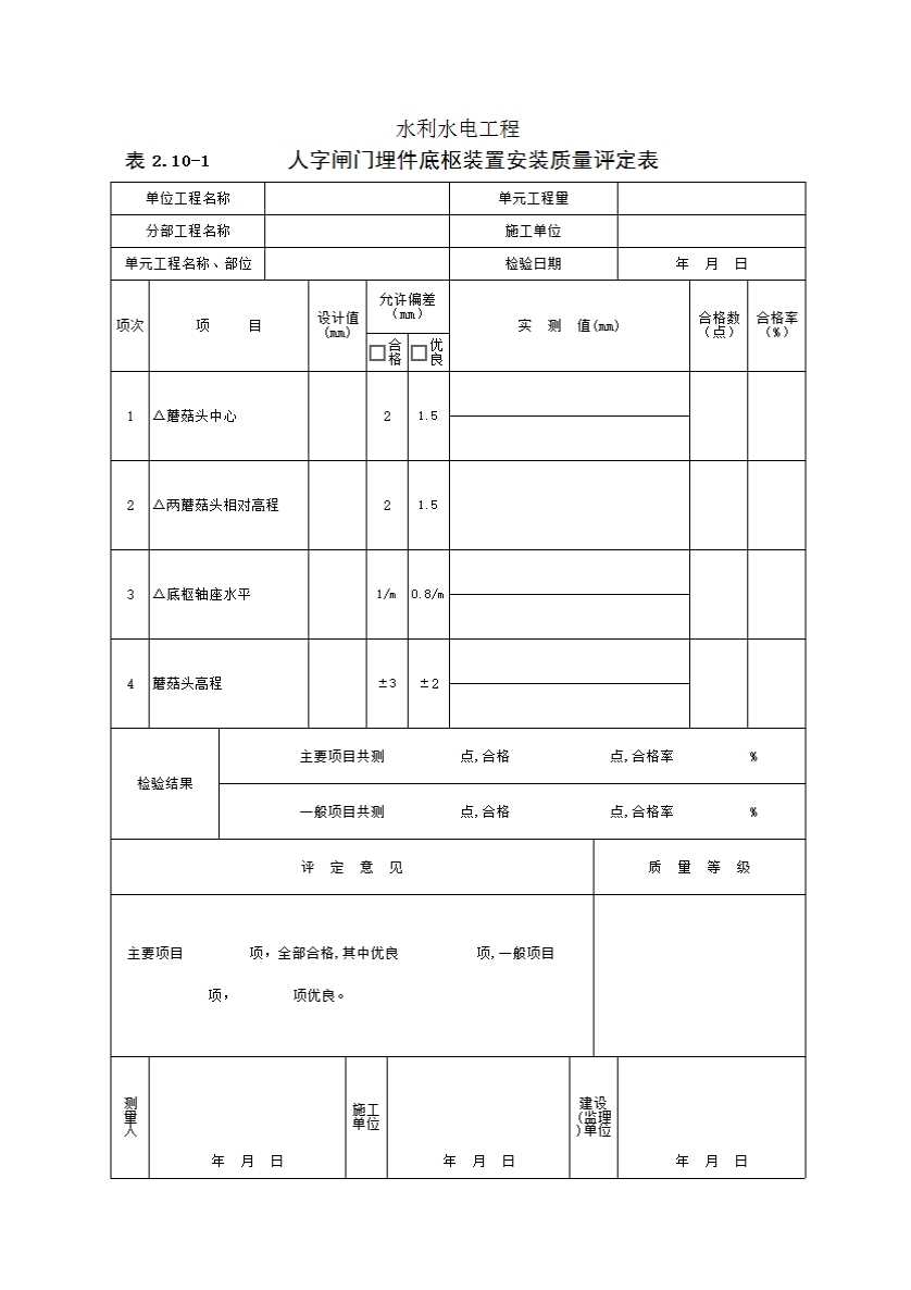 表格名称:表2.10-1 人字闸门埋件底枢装置安装质量评定表