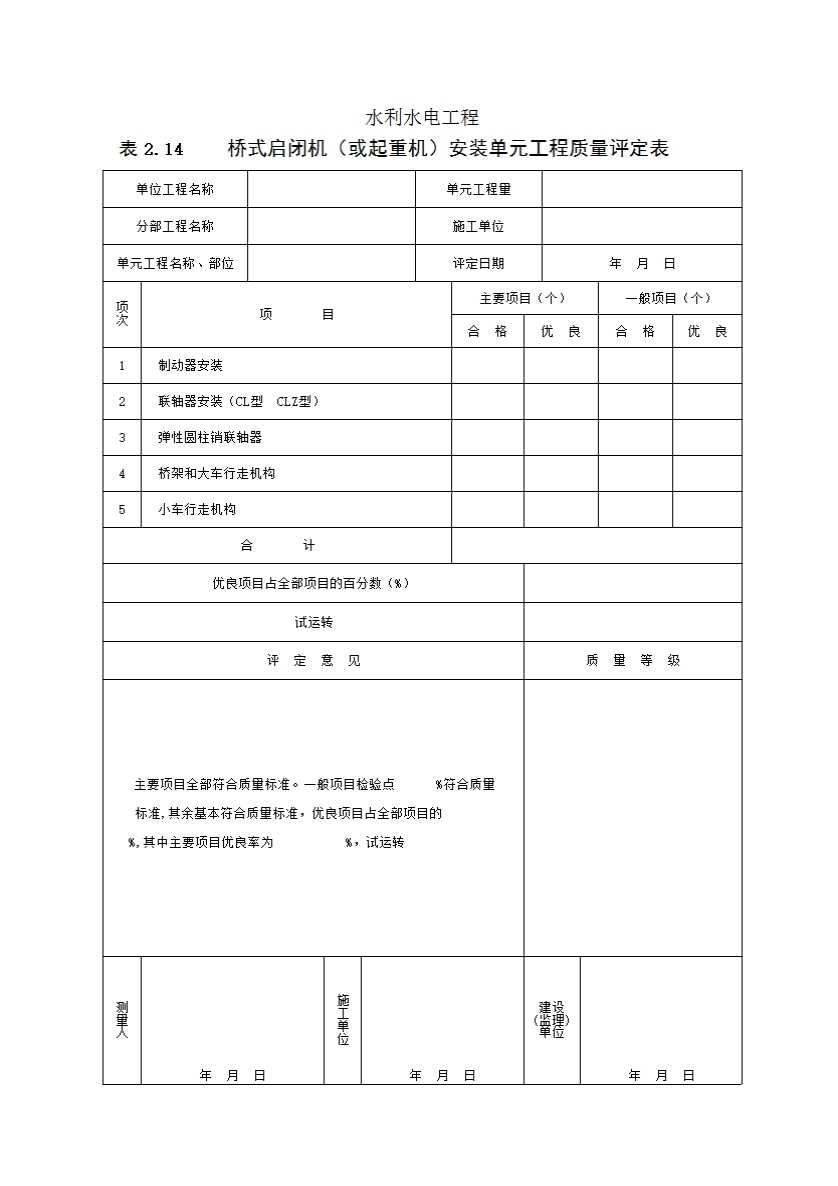 表格名称:表2.14 桥式启闭机(或起重机)安装单元工程质量评定表