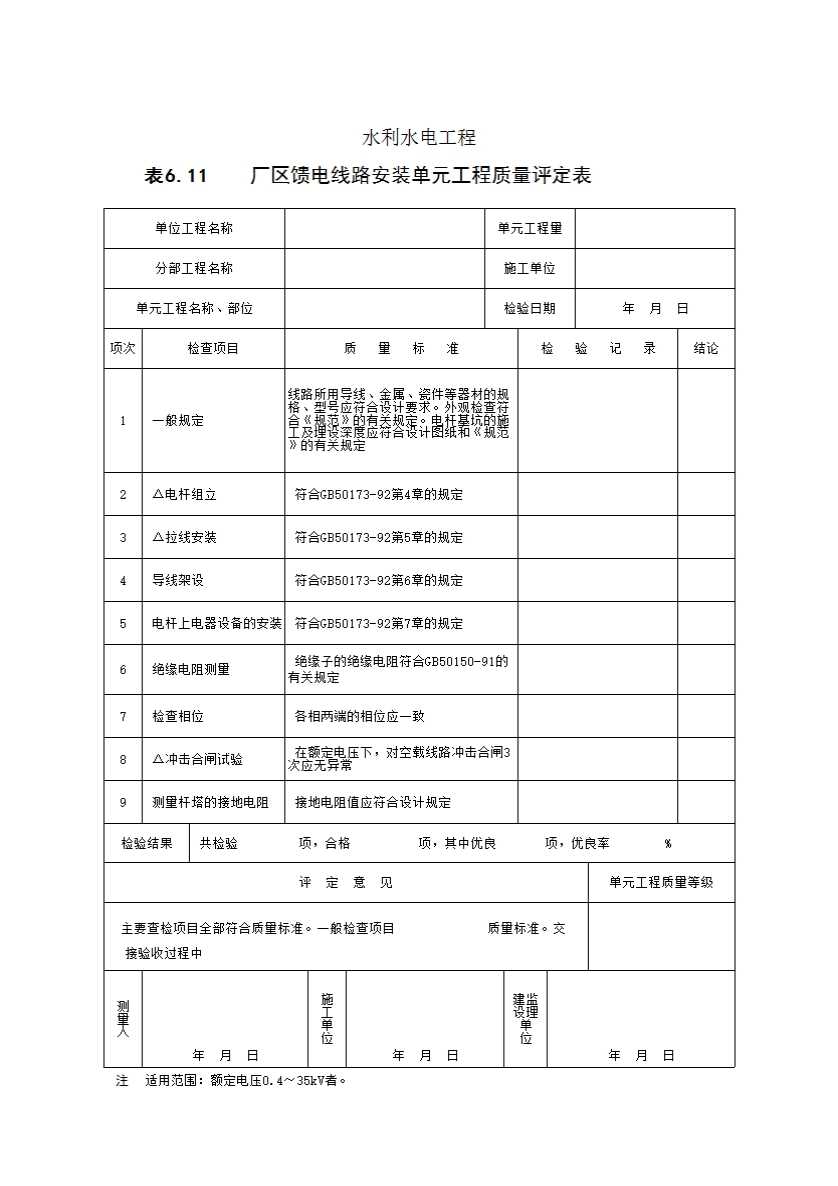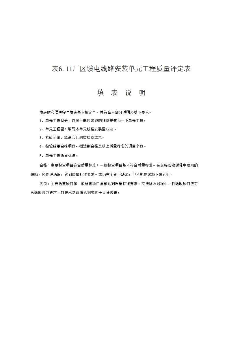 表格名称:表6.11 厂区馈电线路安装单元工程质量评定表