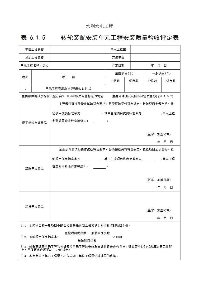 表格名称:表6.1.5 转轮装配单元工程安装质量验收评定表