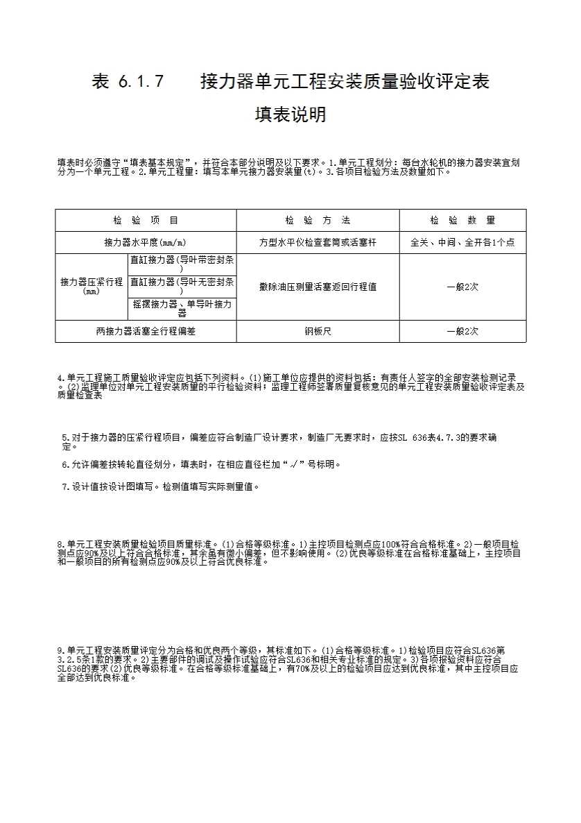 表格名称:表6.1.7 接力器单元工程安装质量验收评定表