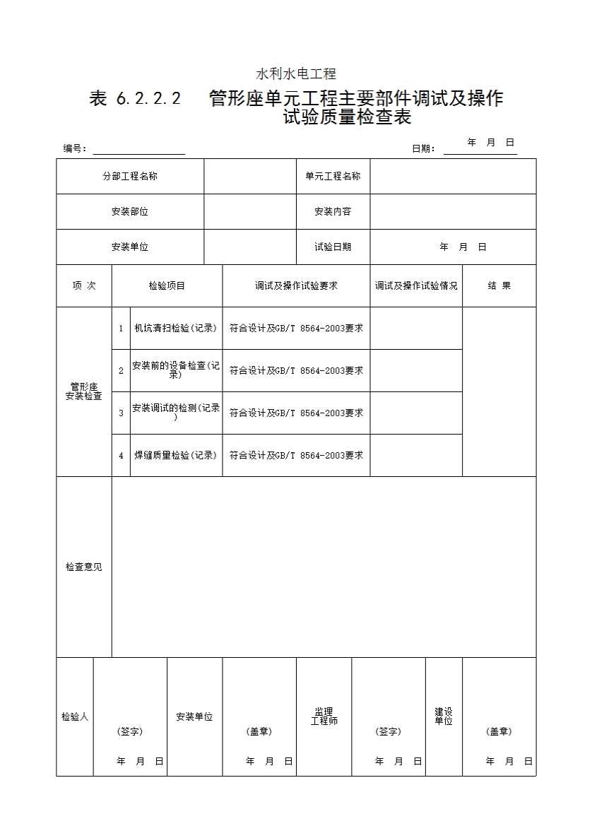 表格名称:表6.2.2.2 管形座单元工程主要部件调试及操作试验质量检查表