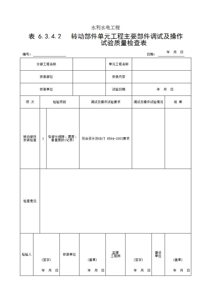 表格名称:表6.3.4.2 转动部件单元工程主要部件调试及操作试验质量检查表