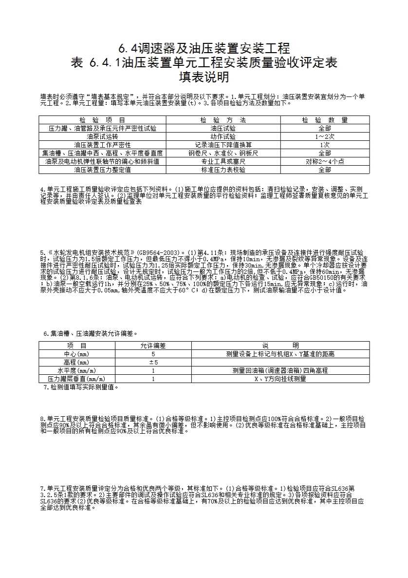 表格名称:表6.4.1 油压装置单元工程安装质量验收评定表