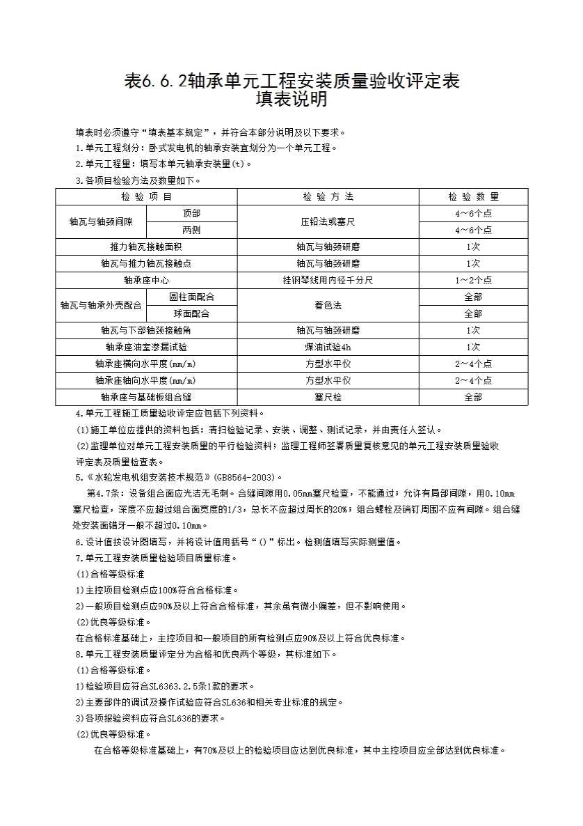 表格名称:表6.6.2 轴承单元工程安装质量验收评定表
