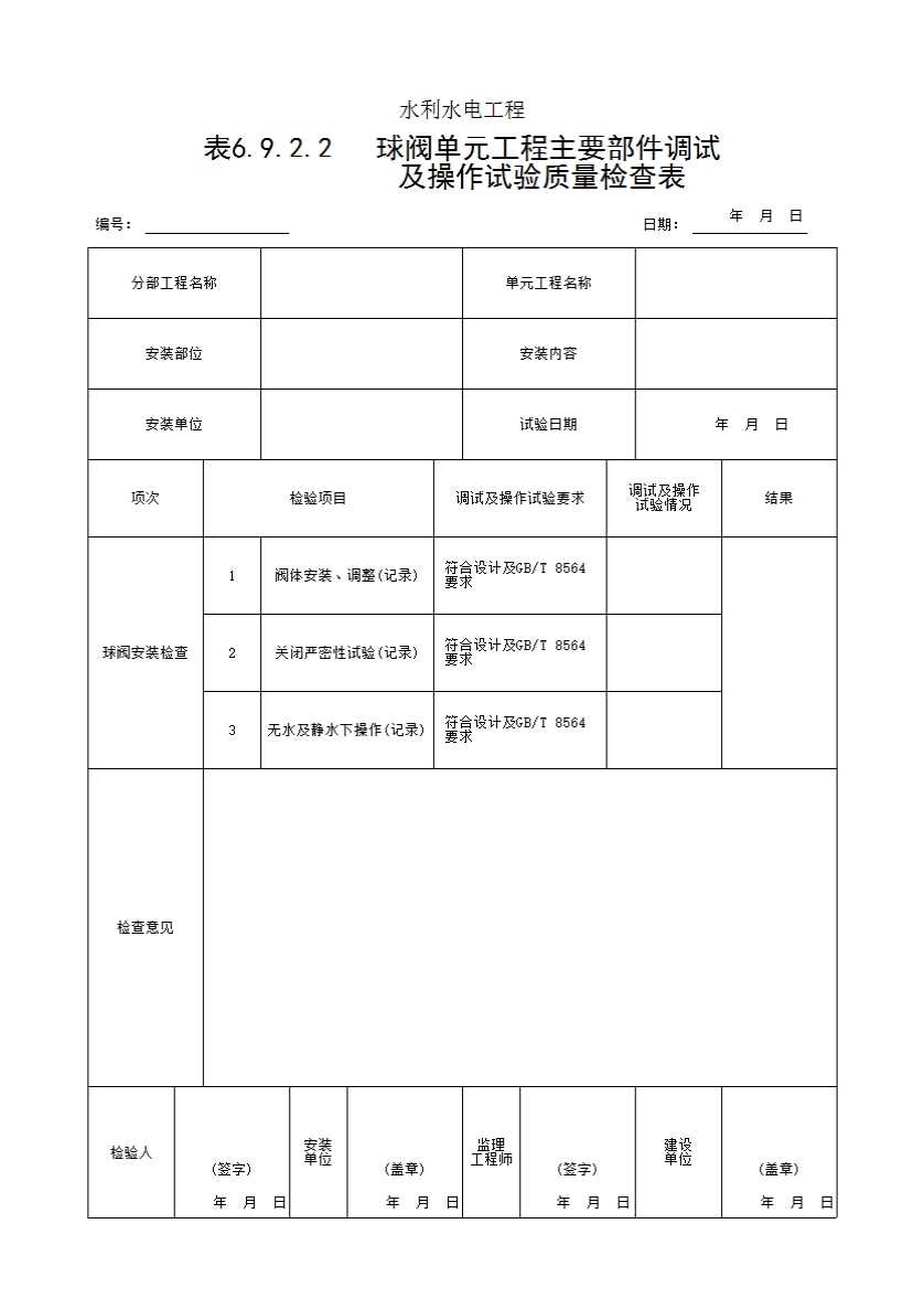 表格名称:表6.9.2.2 球阀单元工程主要部件调试及操作试验质量检查表