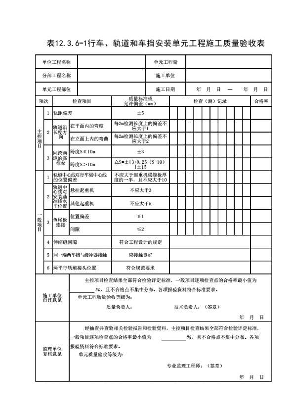 表格名称:表12.3.6-1 行车、轨道和车挡安装单元工程施工质量验收表