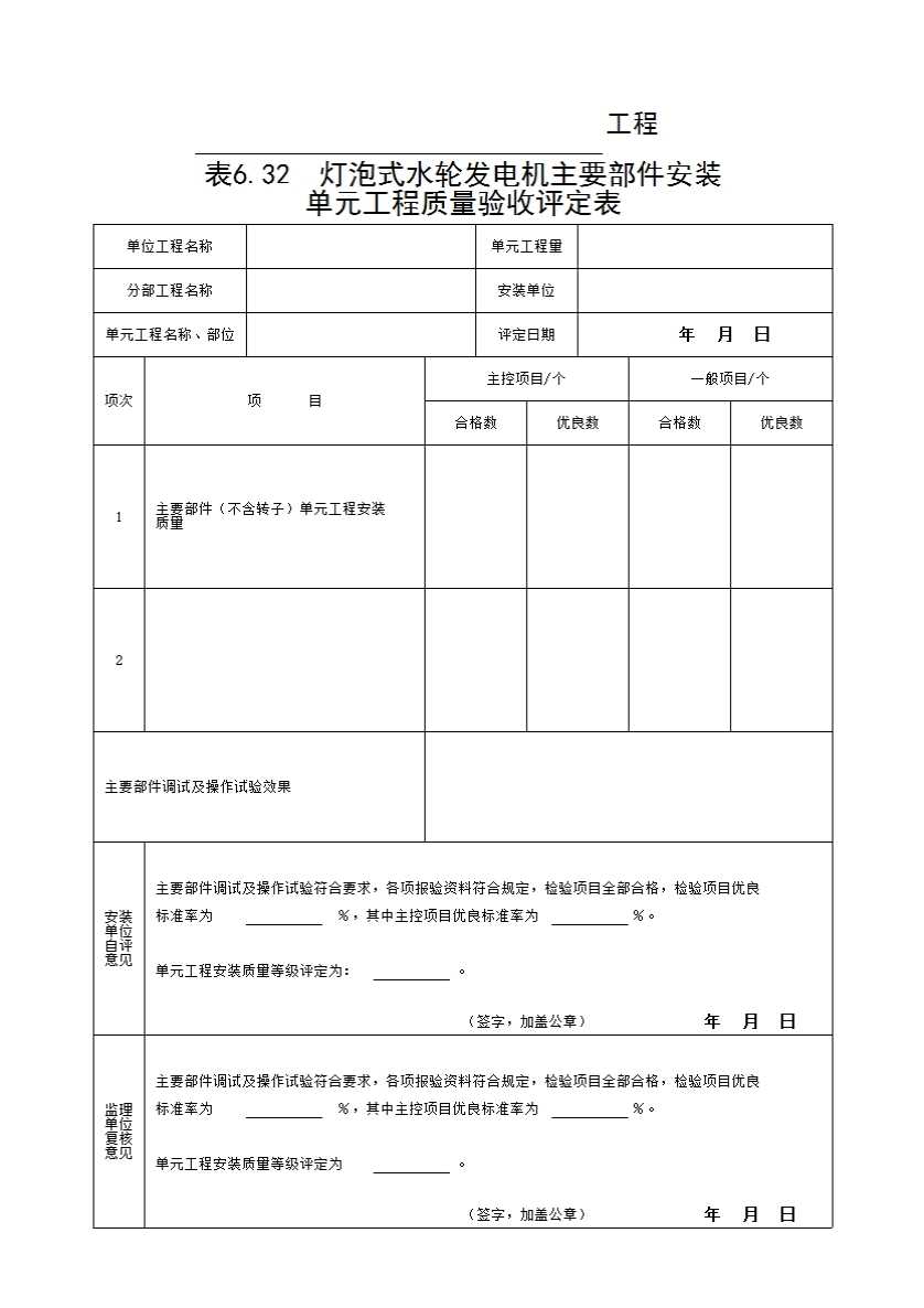 表格名称:表6.32 灯泡式水轮发电机主要部件安装单元工程质量验收评定表