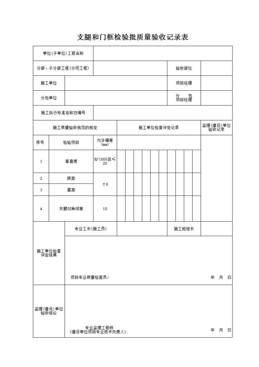 表格名称:支腿和门框检验批质量验收记录表