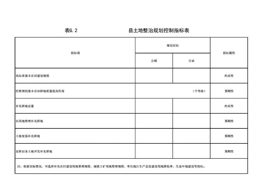 表格名称:表G.2 ××县土地整治规划控制指标表