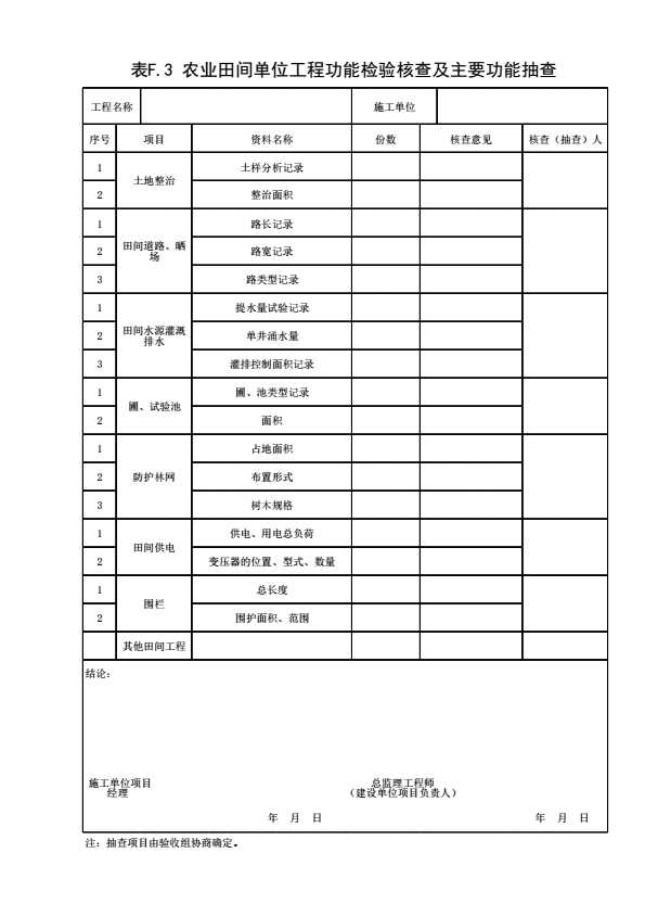表格名称:表F.3 农业田间单位工程功能检验核查及主要功能抽查