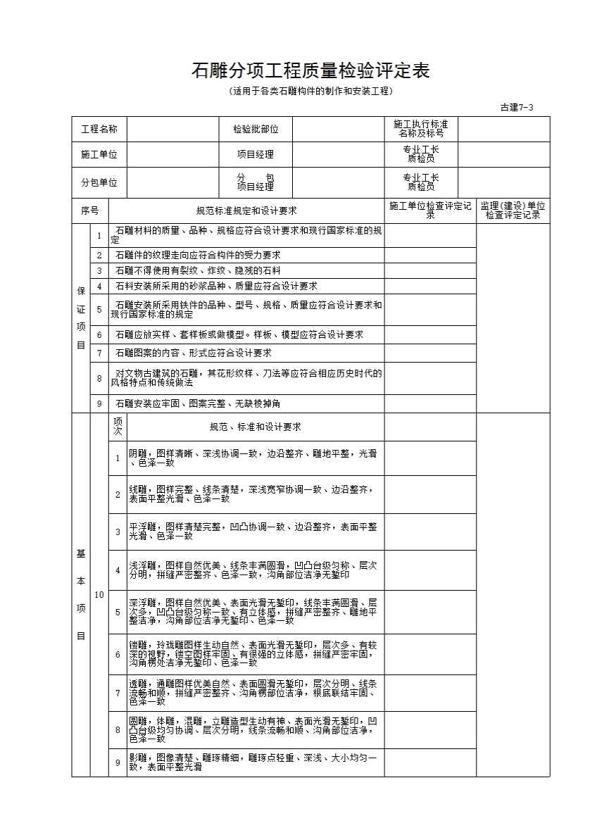 表格名称:古建7-3 石雕分项工程质量检验评定表