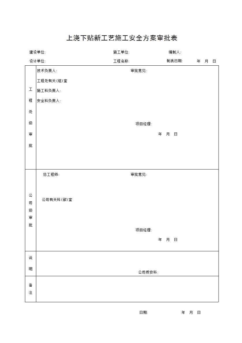 表格名称:上浇下贴新工艺施工安全方案审批表
