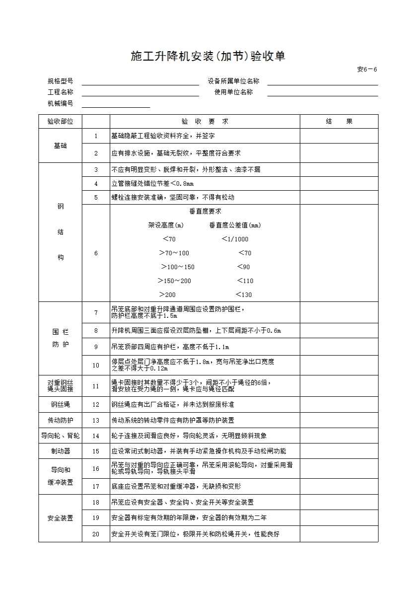 安6—6 施工升降机安装(加节)验收单