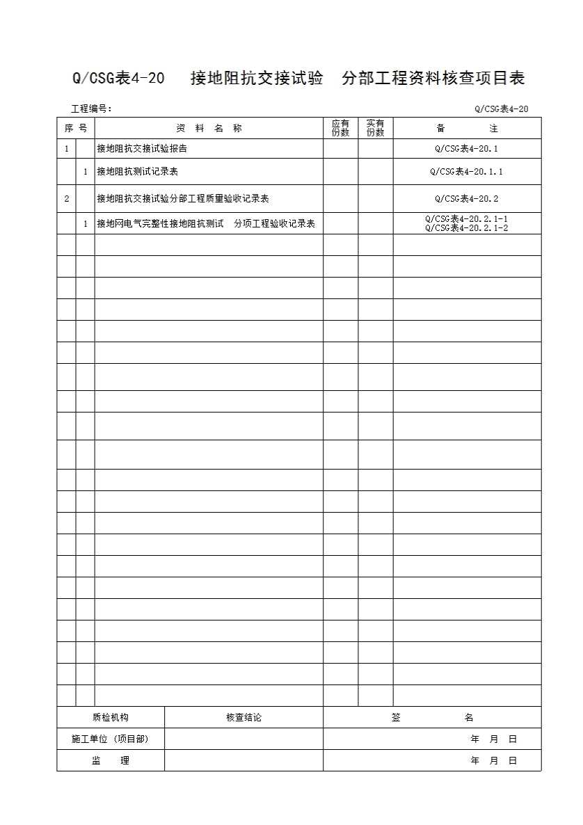 QCSG 表 4-20 接地阻抗交接试验 分部工程资料核查项目表
