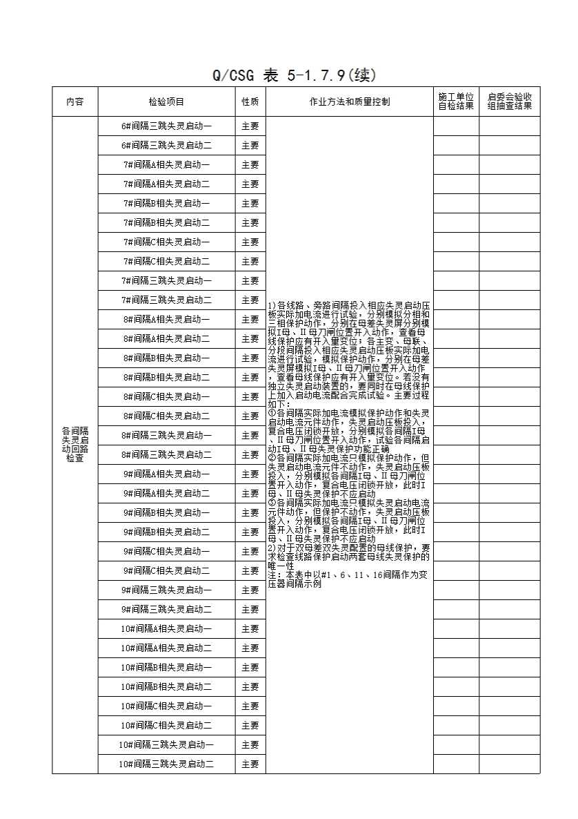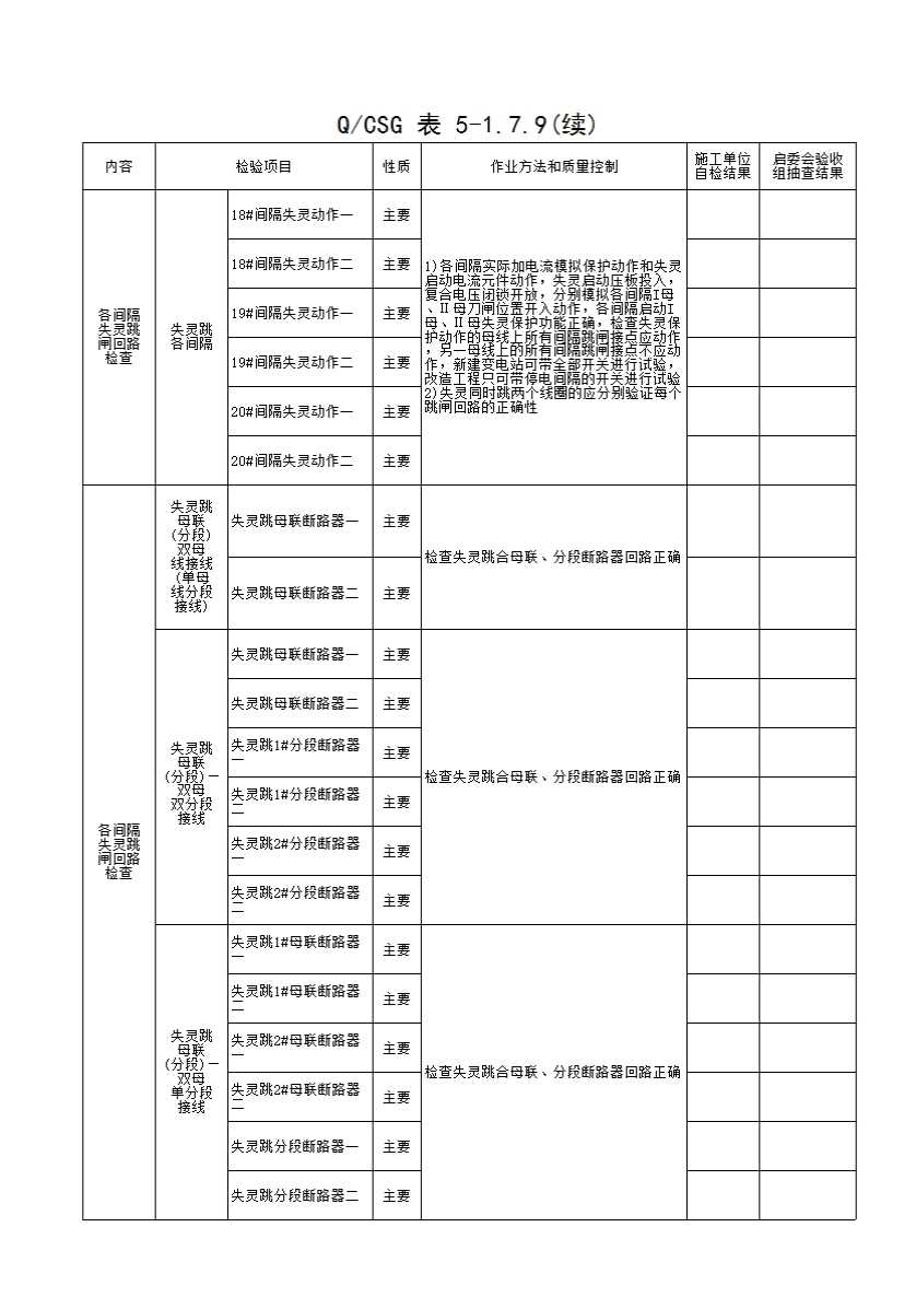 表格名称:QCSG 表 5-1.7.9 220kV_____母线保护 重点回路检查 分项工程质量验收记录表